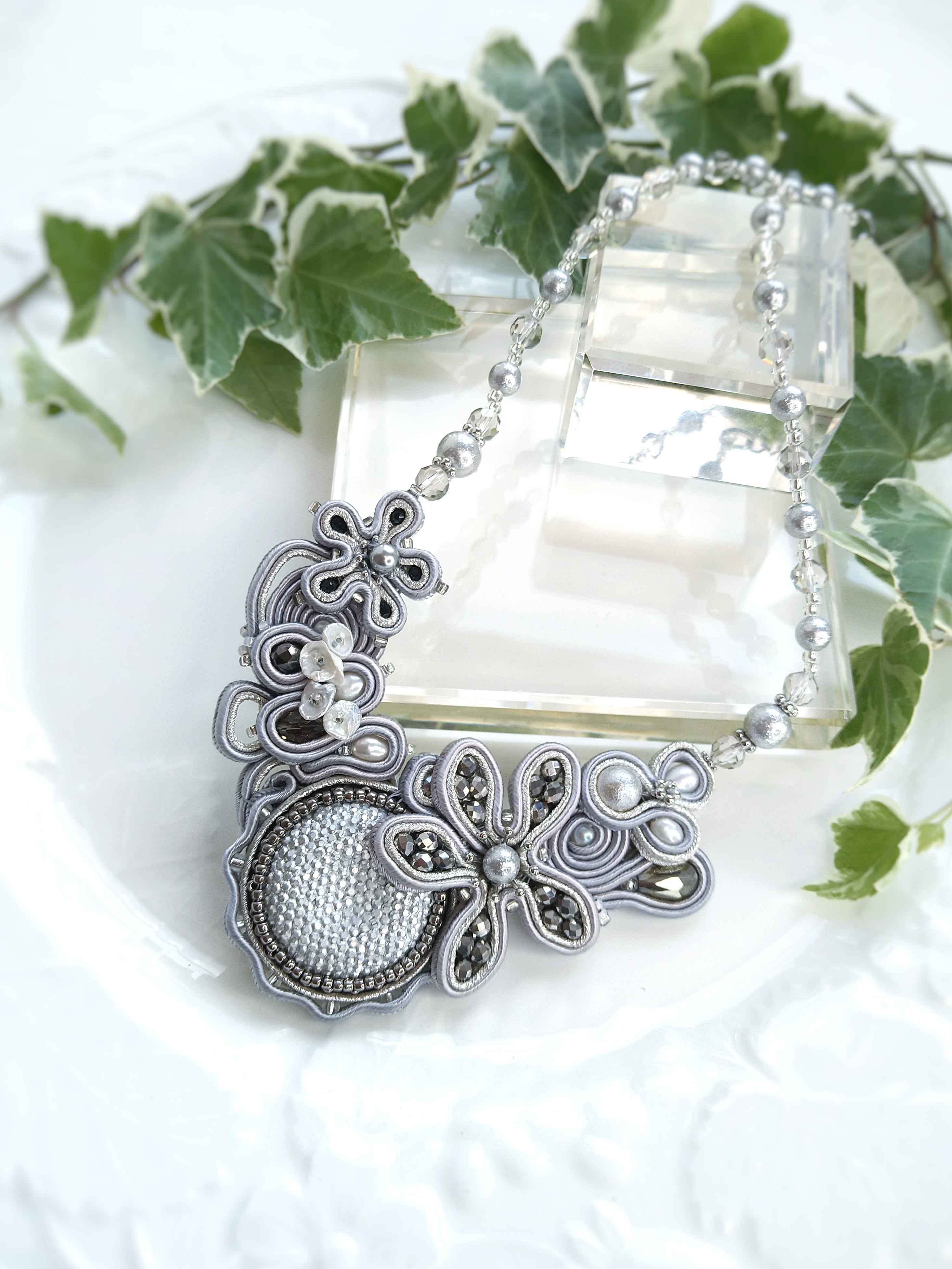【ネックレス】大人の魅力の華やかなシルバーグレーのフラワーネックレス 日高真理子先生作品